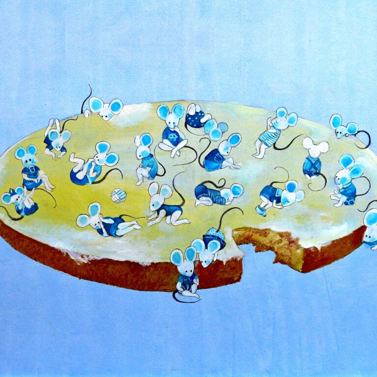Deze liefdevol geschilderde wanddecoratie tovert iedere babykamer om tot een warm en romantisch plekje vol zachtheid. Op het schilderij prijkt een heerlijk beschuitje met romige boter, rijkelijk bedekt met schattige blauwe muizen. De kleine babymuisjes liggen knus tegen elkaar aan te slapen, spelen vrolijk samen of rollen speels over het boterige oppervlak.