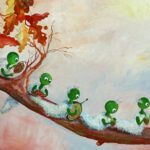 Deze charmante wandcirkel van Twinkelschilderijen toont een rij processierupsen die over een herfsttak kruipen, elk met een eigen kapsel en een klein muziekinstrumentje in de hand. Het kunstwerk combineert speelsheid, fantasie en herfstige sfeer, waardoor het een vrolijke en originele toevoeging is aan elk interieur.